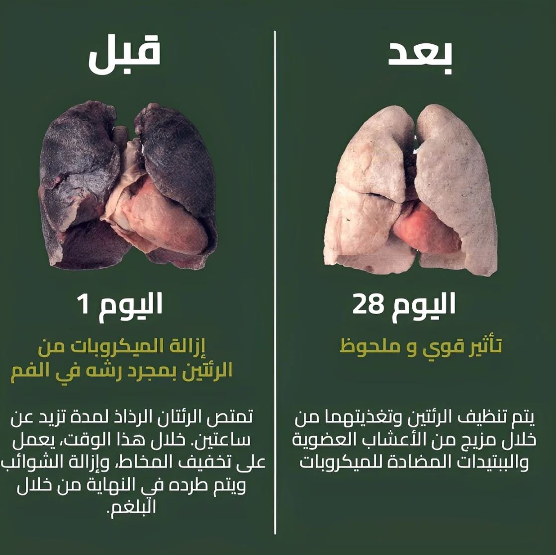 بعد أسبوع واحد بتلاحظ فرق واضح — الكحة تقلّ والتنفس يصير أسهل والرئة تحسّنها واضح. وبعد 3 أسابيع، رئتك بتصير صافية 100% وتحس بنشاط وانتعاش ما حسّيت فيه من قبل! 💨🌿